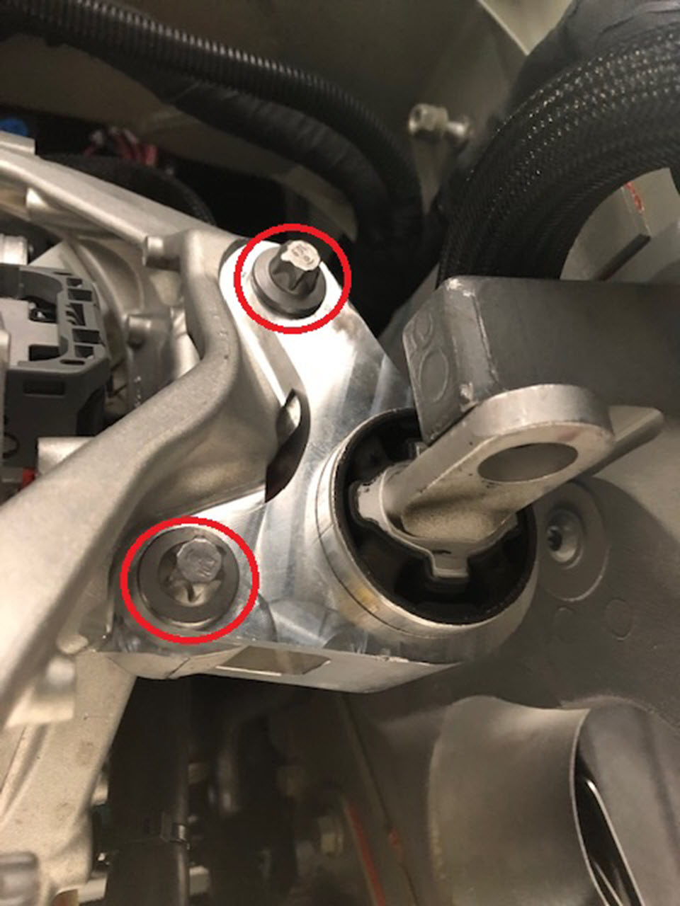 - Remove the bolts (x2) that attach the isolator mount to the front drive unit (torque 38 Nm), and then remove the isolator mount from the front drive unit.
