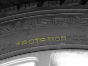 The appropriate tire rotation pattern depends on the design of the tire. Check the sidewall to see if there is an arrow showing a specific rotation direction. If so, the tire is directional. When the vehicle is traveling forward, these tires must roll in the indicated direction.