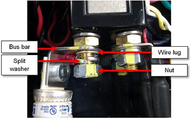 the components from bottom to top: nut, split washer, wire lug, bus