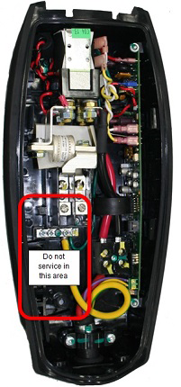 CAUTIONWhen removing the front cover, do not damage the ribbon cable. Disconnect the ribbon cable before fully releasing the front cover.CAUTIONDo not service the area from the utility input to the left terminal blocks. This wiring is considered house wiring, and must be connected and serviced by a certified electrician.