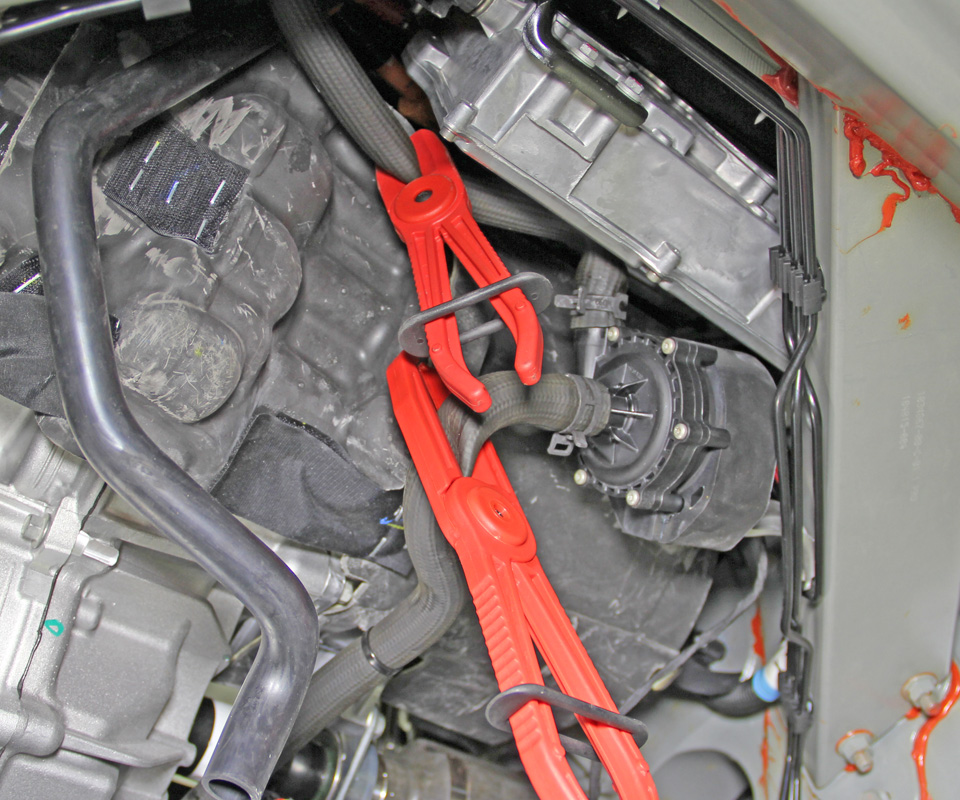 - Clamp the coolant pump hoses, but do not release the hoses at this time.