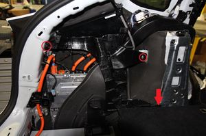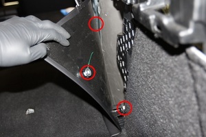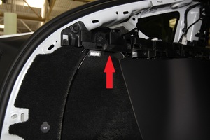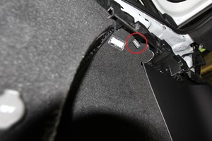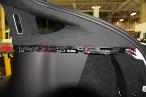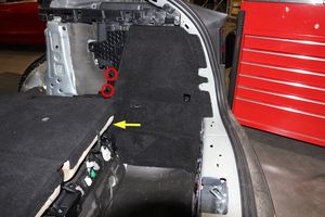 - Pull rear lower corner of RH trunk side carpet panel out and downwards to remove panel