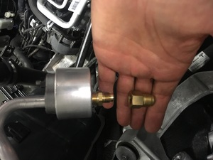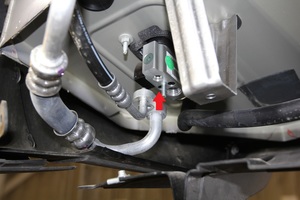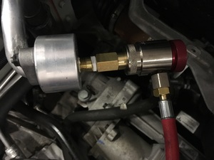 Connect hoses to vehicle and perform A/C vacuum and leak test