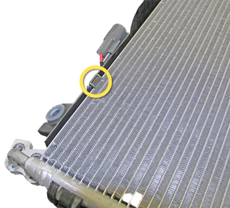 - Release the tab that secures the LH side of the condenser to the condenser fan and pivot the condenser towards the LH side of the condenser fan.