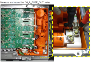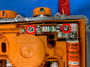 - Remove the screws (x2) that attach the 30A PTC fuse to the busbars, and then remove the fuse.