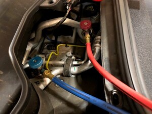 Connect hoses to vehicle and perform A/C recovery. See A/C Refrigerant Recovery and Recharge (Remove and Replace).