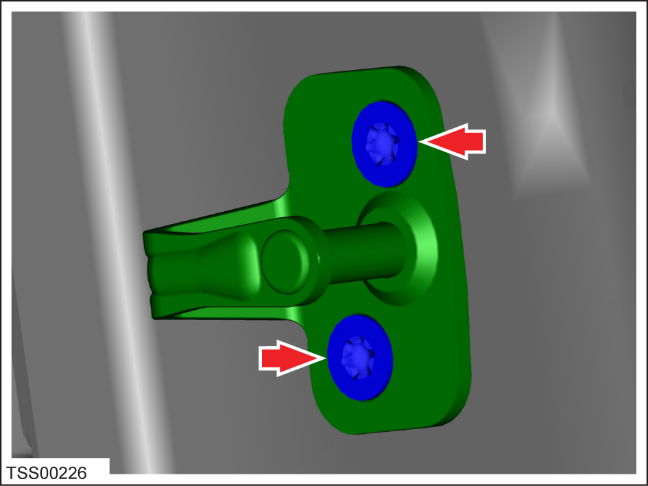 Remove Open the front door. Remove the countersunk screws (x2) that secure the striker plate to the B-pillar (torque 22 Nm). Informational PurposesAn informational icon, calling your attentionNoteNote the installed position of the components before removal. Remove the door striker from the vehicle.