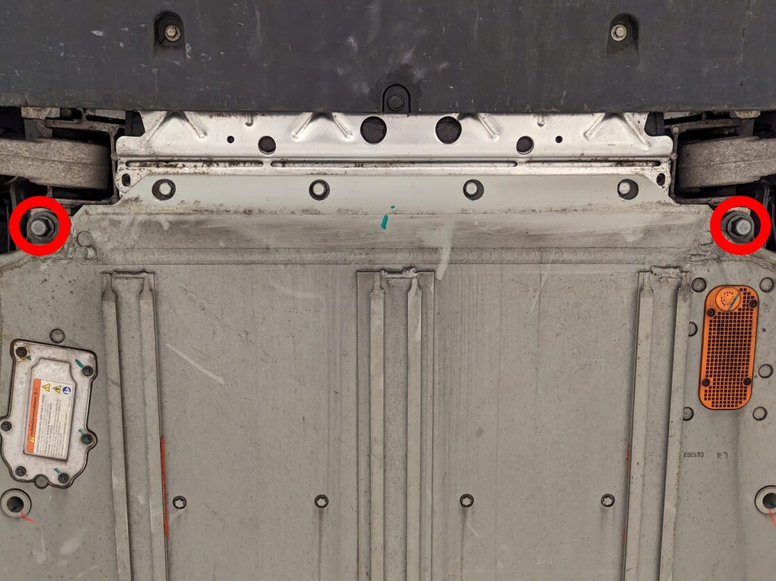 Loosely install new bolts (x2) at the front of the HV battery with a battery powered drill.