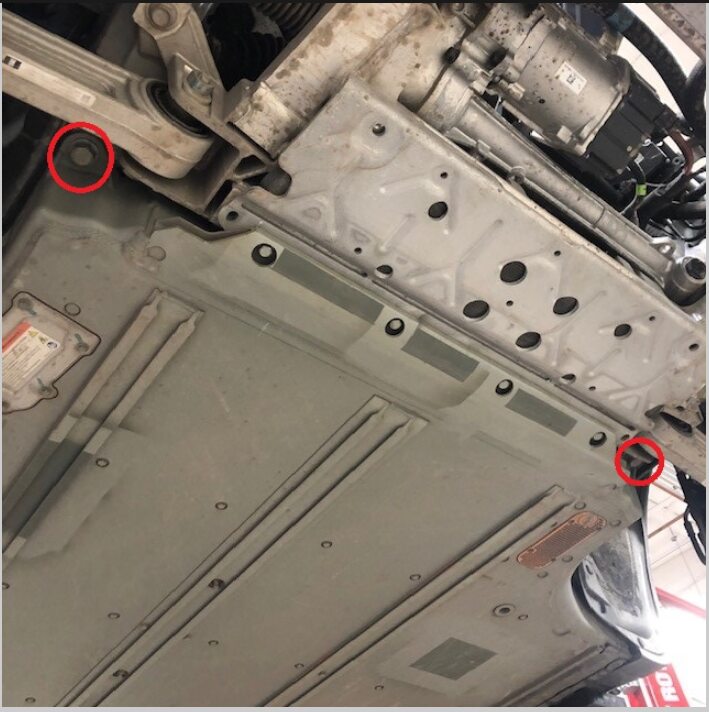 Loosen the bolts (x2) that secure the front of HV battery. After both bolts have been loosened, use a battery powered drill to remove and discard the bolts.