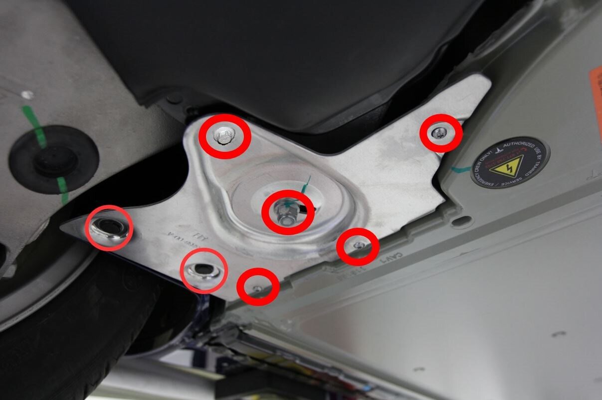 Loosen the front HV battery bolts (x4). After all 4 bolts have been loosened, use a battery powered drill to remove and discard the bolts.