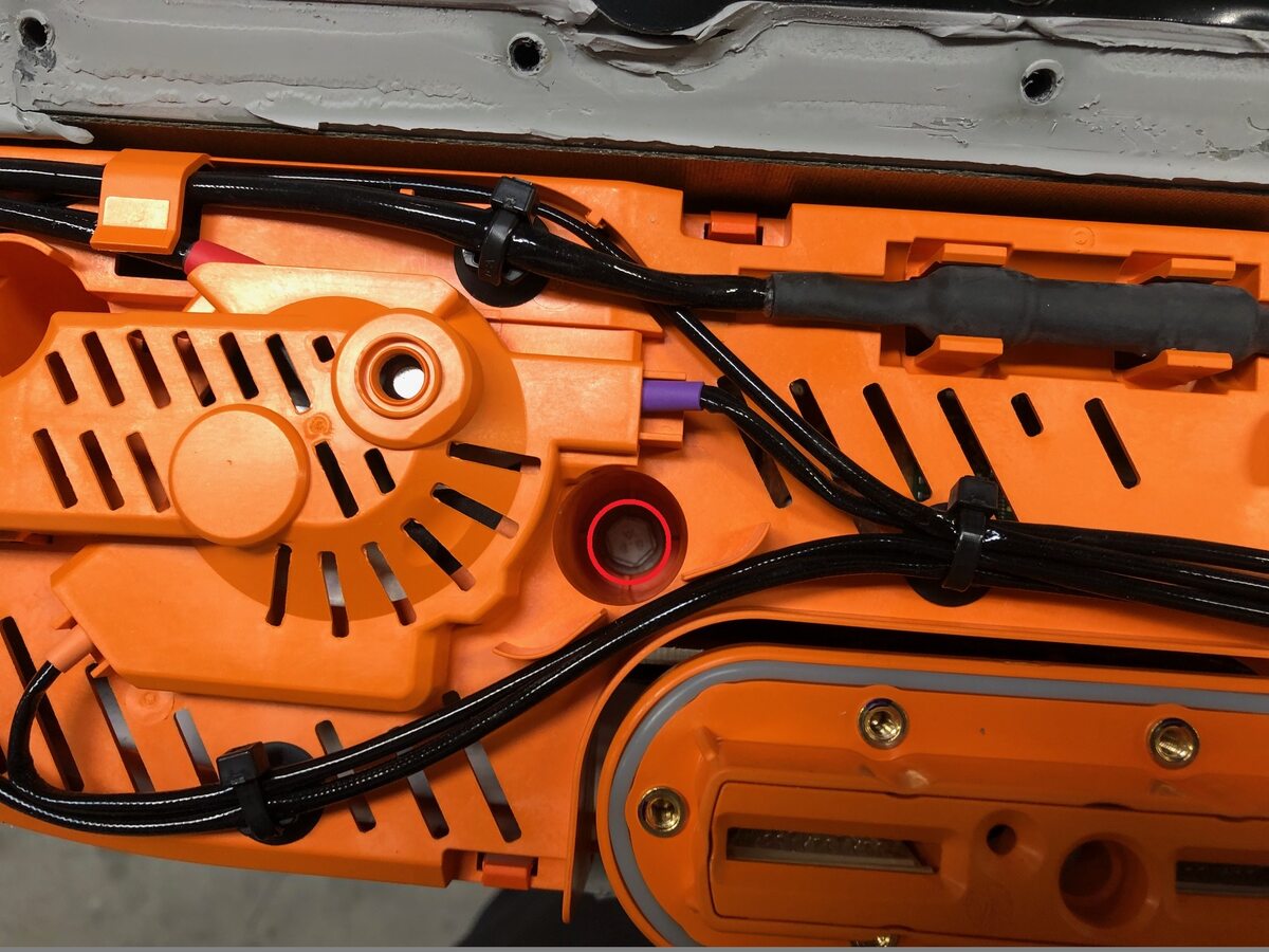 - Install the orange insulating cap over the spine terminal busbars. Use a pink paint pen to mark the top of each cap after it is installed.