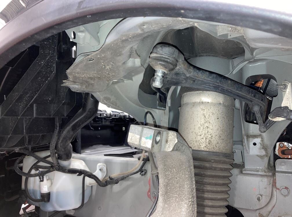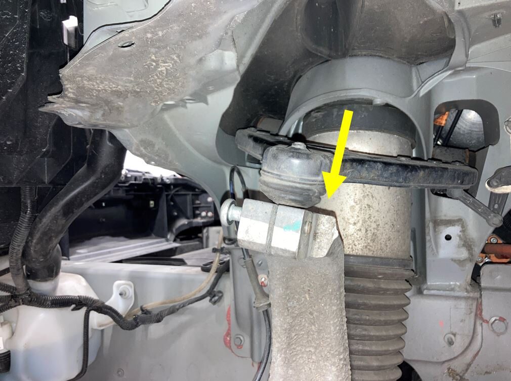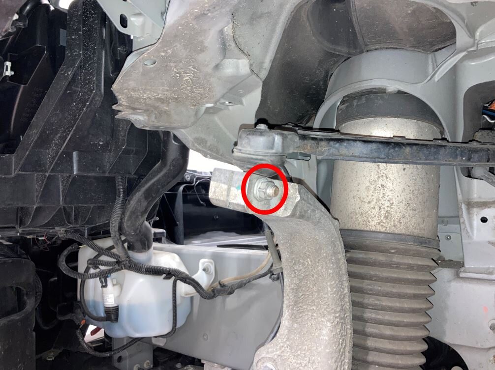 - Remove and discard the nut that attaches the LH front upper control arm to the knuckle, and then compress the ball joint downwards to release the bolt.