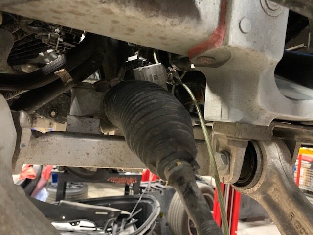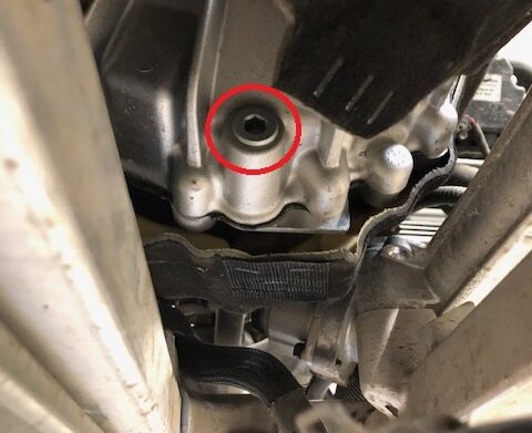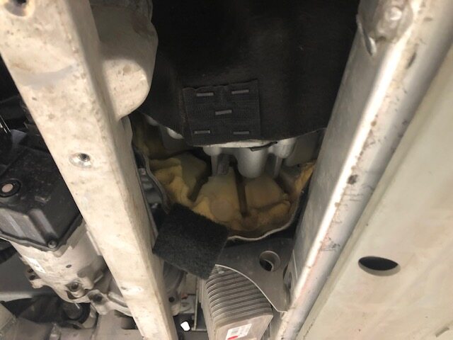 - Install the bolts (x2) that attach the skid plate to the front subframe (torque 9 Nm).