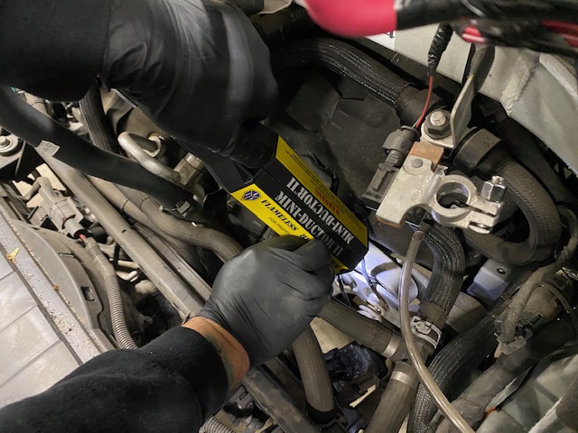 - Install new patch bolts (x4) that attach the front of the HV battery to the vehicle (torque 30 Nm).