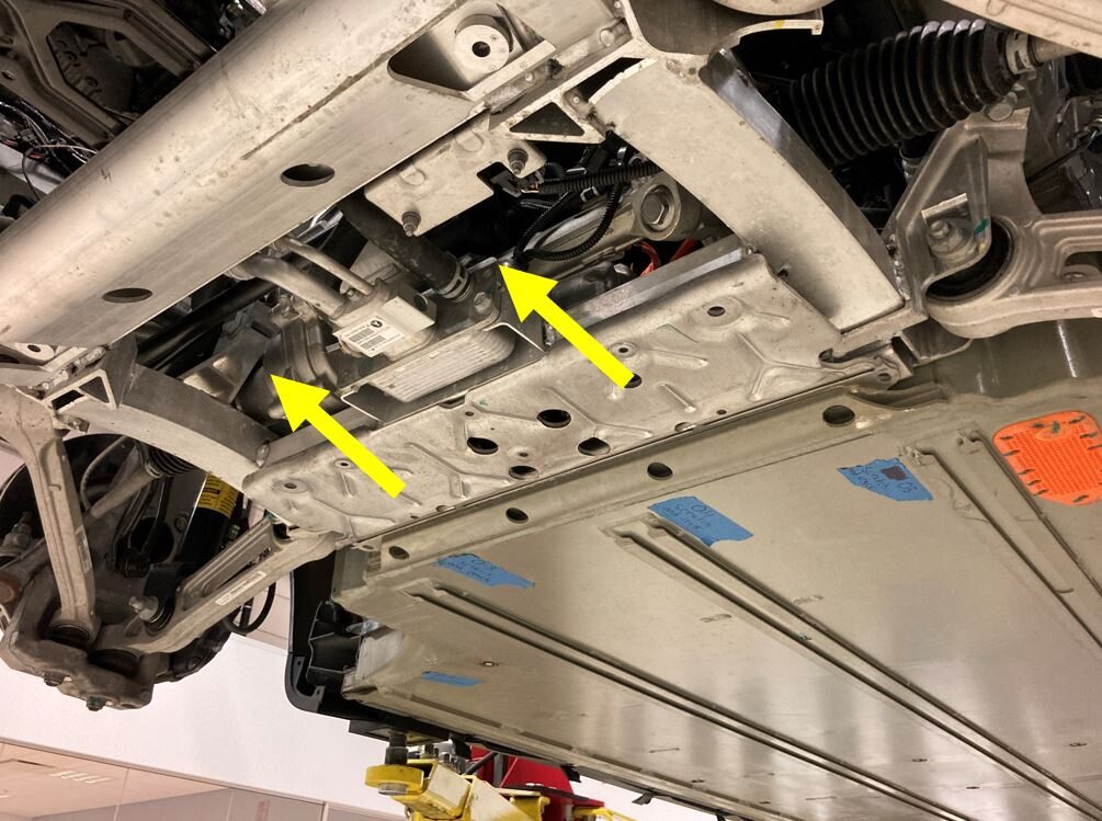 - Install the bolts (x2) that attach the front bash plate extrusion (torque 16 Nm).