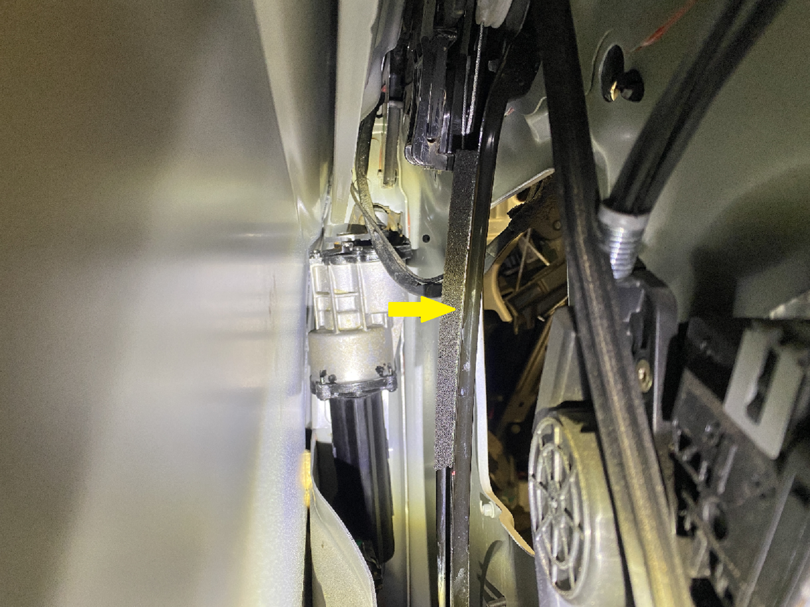 - Release the two nuts that attach the glass run channel to the door (torque 10 Nm).