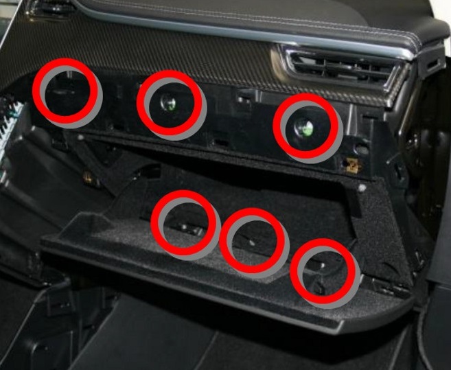 - Remove the screws (x6) that secure the glove box to the instrument panel (torque 2.3 Nm).