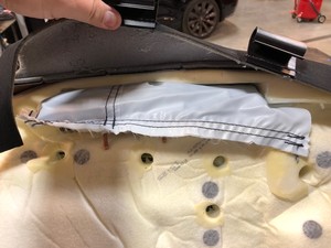 NoteStart by sliding the foam trim straight onto the seat back frame, Ensure the posts for the headrests engage the seat back foam, Ensure the heater harness and lower trim that engages the frame are pushed through to the back side of the frame, Ensure that both sides of the seat back cushion overlap the seat back frame