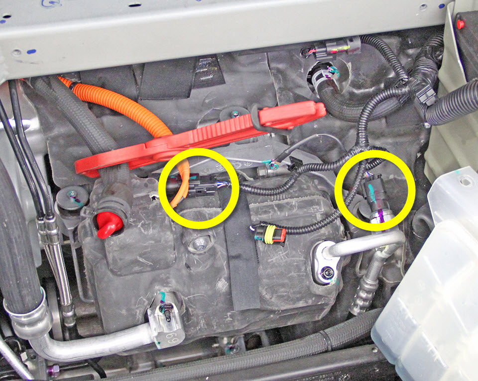 - Release the edge clip that attaches the 12V harness to the compressor bracket.