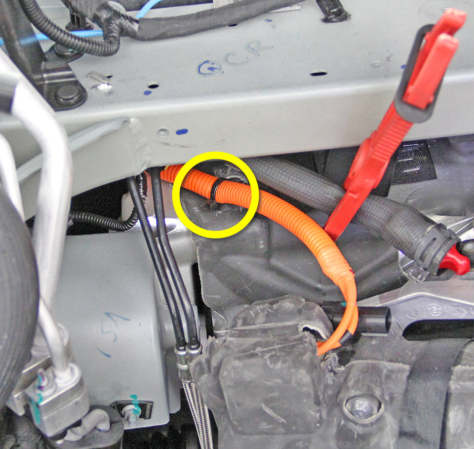 - Release the push clip that attaches the A/C compressor HV cable to the body of the vehicle.