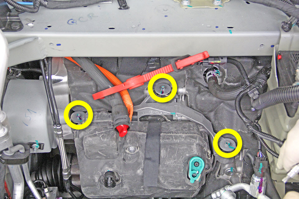 - Have an assistant support the compressor. Release the bolts (x3) that attach the A/C compressor bracket to the front drive unit (torque 10 Nm).