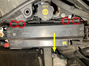 - Release the tabs (x4) that secure the frunk fuse box, and move the fuse box upwards then forwards.