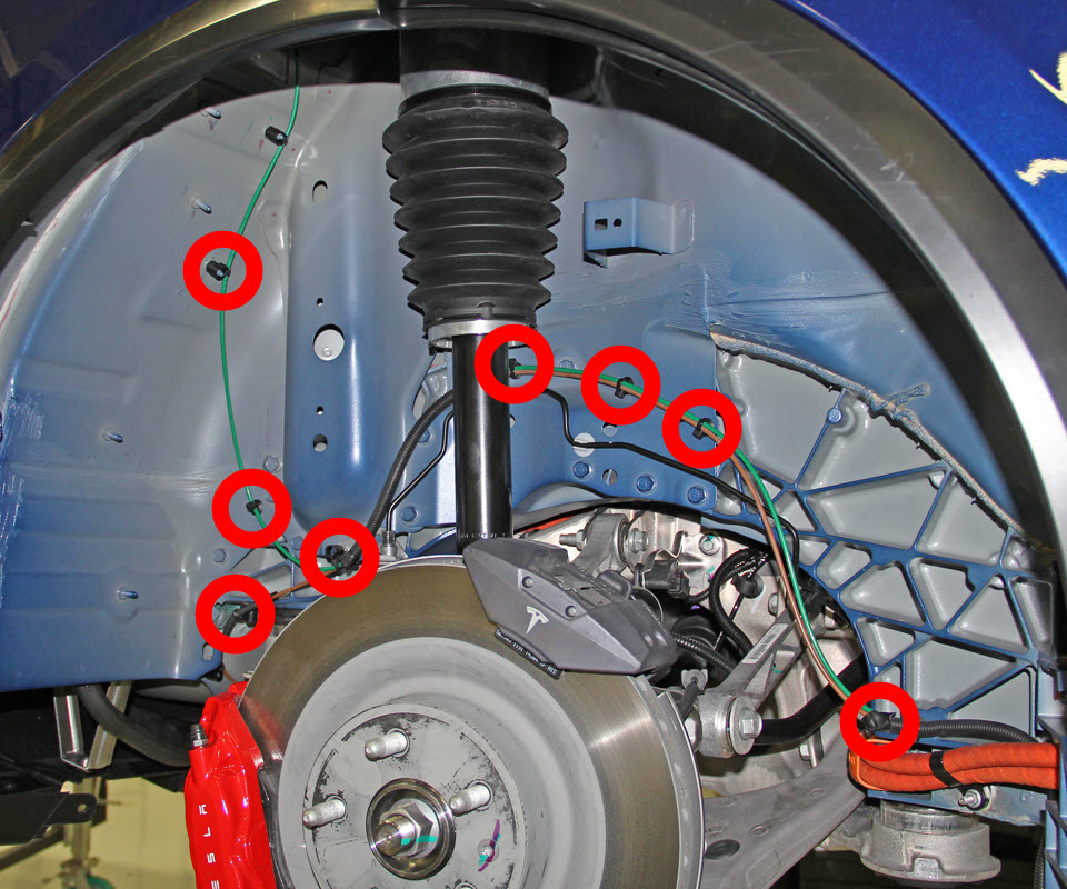 - Release the clips (x8) that attach the air spring module lines (green and brown) to the RH front wheel arch.