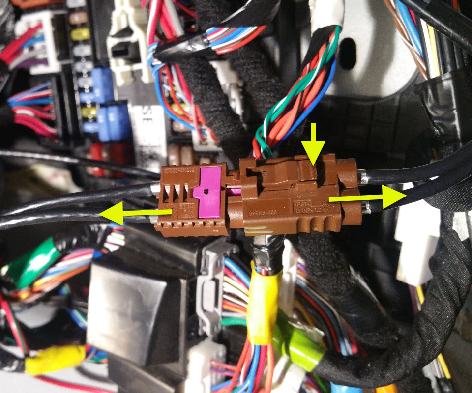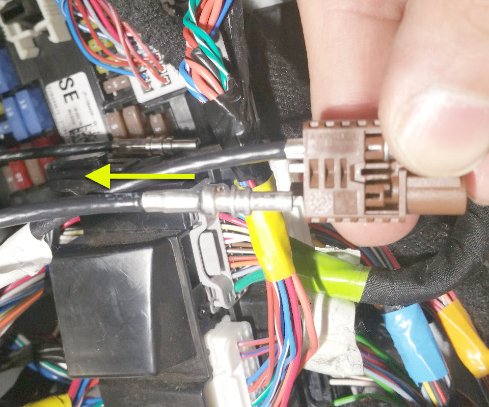 - Use the pin drag kit to carefully lift the locking tab of cavity 1 on the dual connector, and at the same time, pull the LH repeater coax cable from the dual connector.