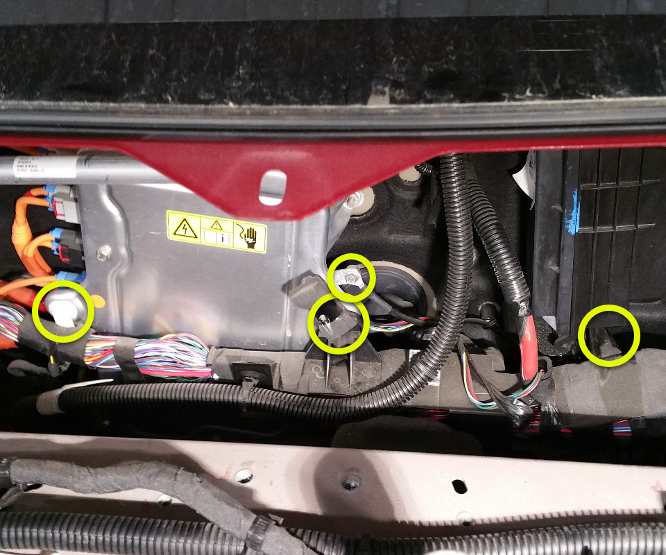 - Fasten the clips (x3) that attach the main front electrical harness to the bulkhead, and then install the screw that attaches the ground strap to the HV junction box (torque 9 Nm).