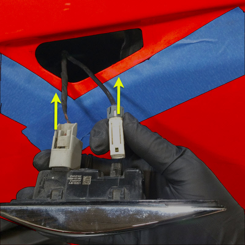 - Connect the LH repeater light connector and LH repeater coax cable connector to the new repeater assembly.