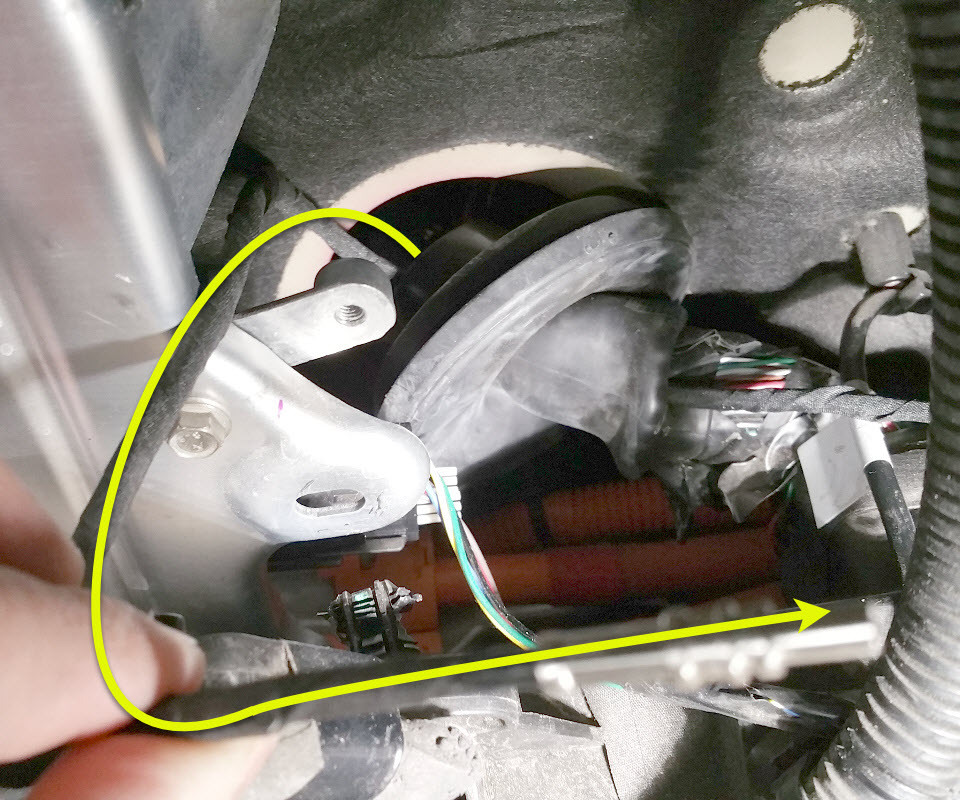 - Remove the screw that attaches the ground strap to the HV junction box, and then release the clips (x3) that attach the main front electrical harness to the bulkhead.