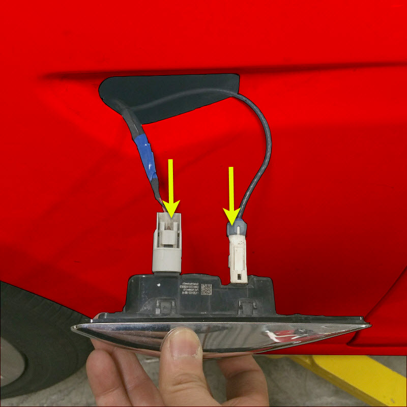 - Disconnect the repeater electrical harness from the LH side repeater connectors, and then remove the repeater assembly from the vehicle.