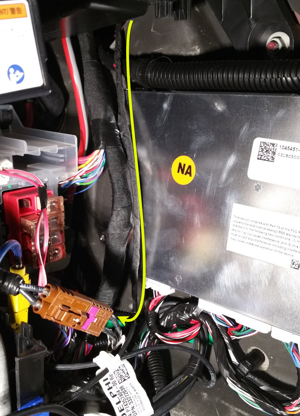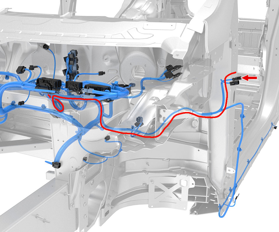 - Route the LH repeater coax cable along the frunk electrical harness, along the old coax cable, and out the side repeater hole in the LH fender.
