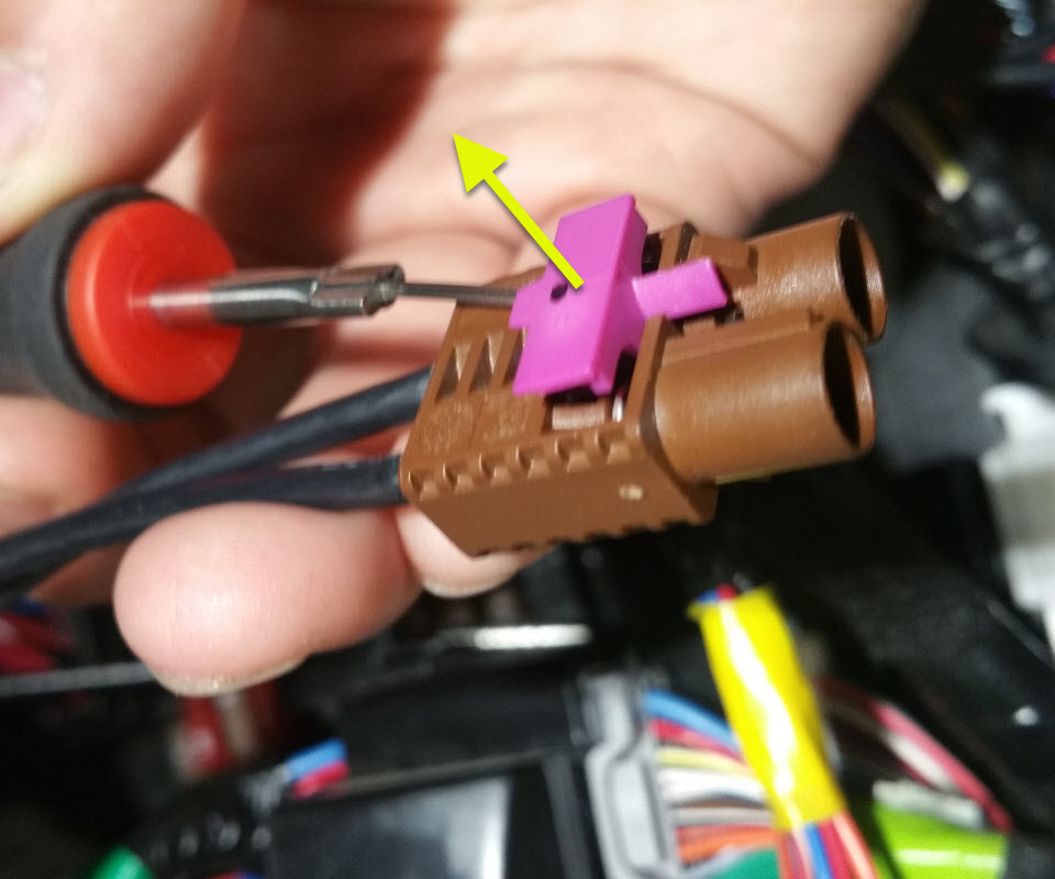 - Use the pin drag kit to carefully lift and remove the purple locking insert out of the dual connector.