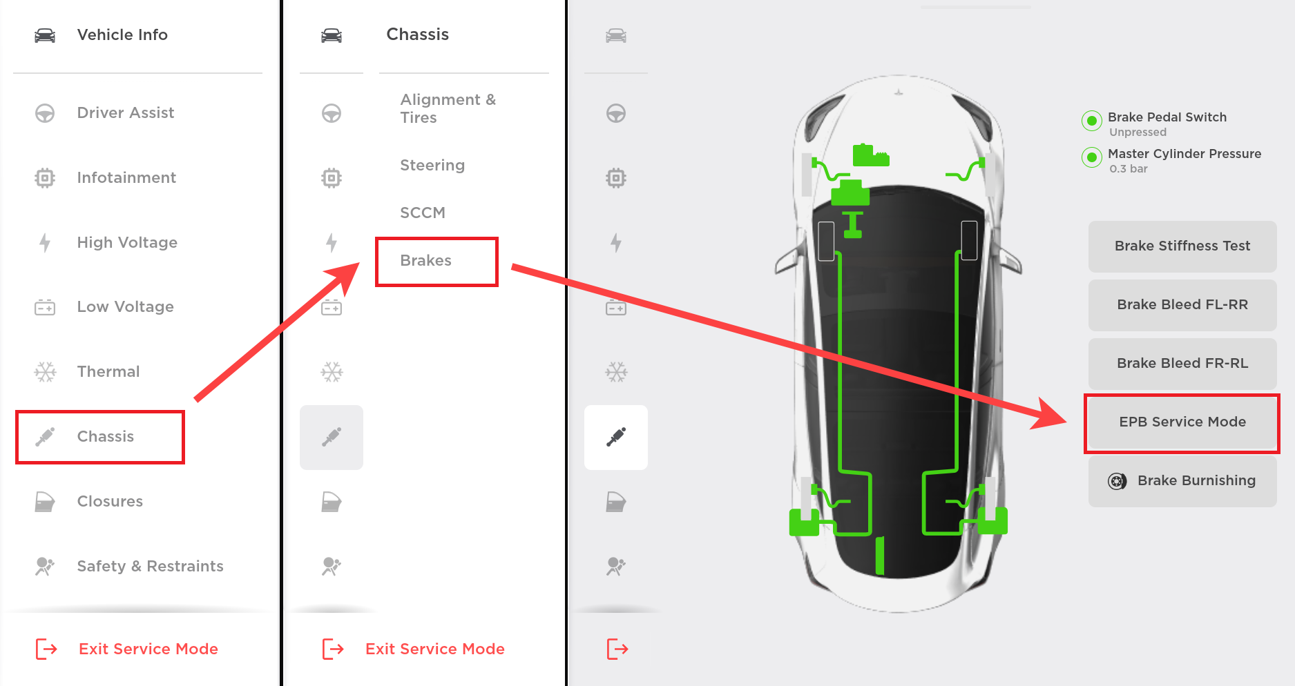 - On the touchscreen, under Vehicle Info, touch Chassis, under Chassis, touch Brakes, and then in the diagram, touch EPB Service Mode.