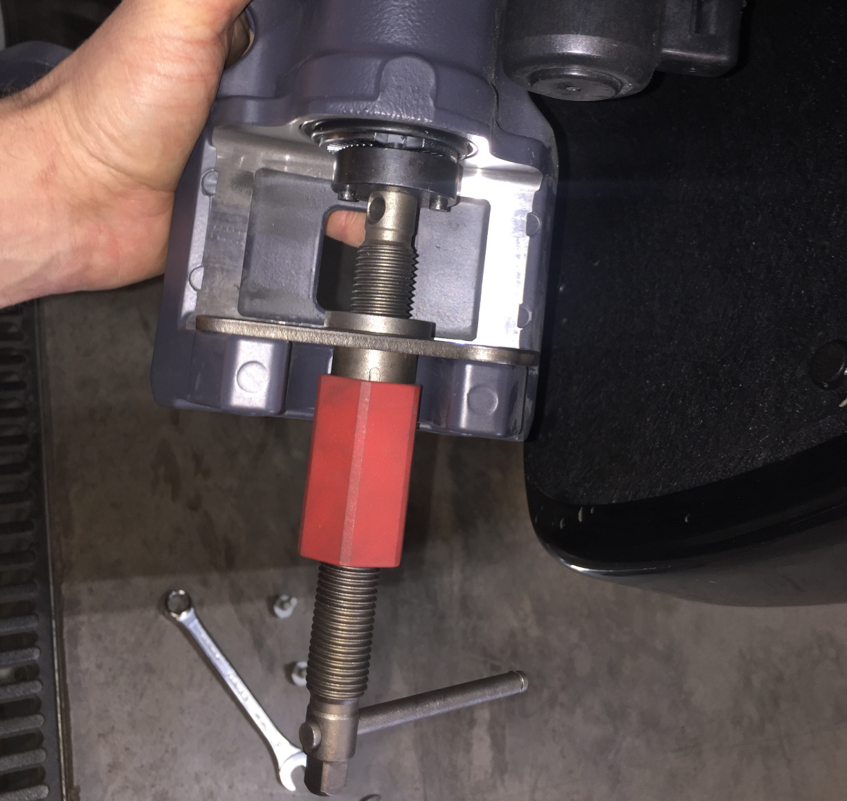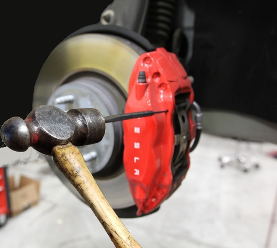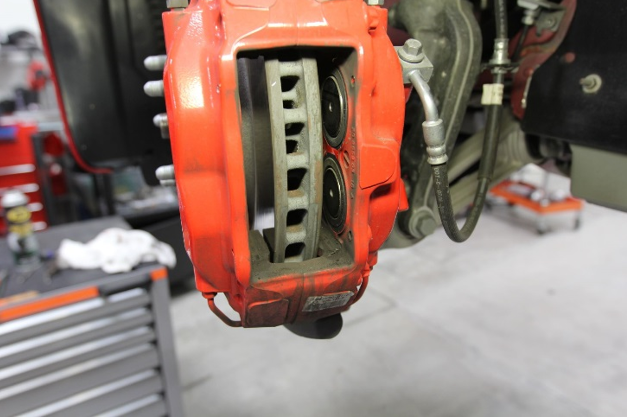 - Use the caliper spreader to compress the piston into the rear LH caliper.