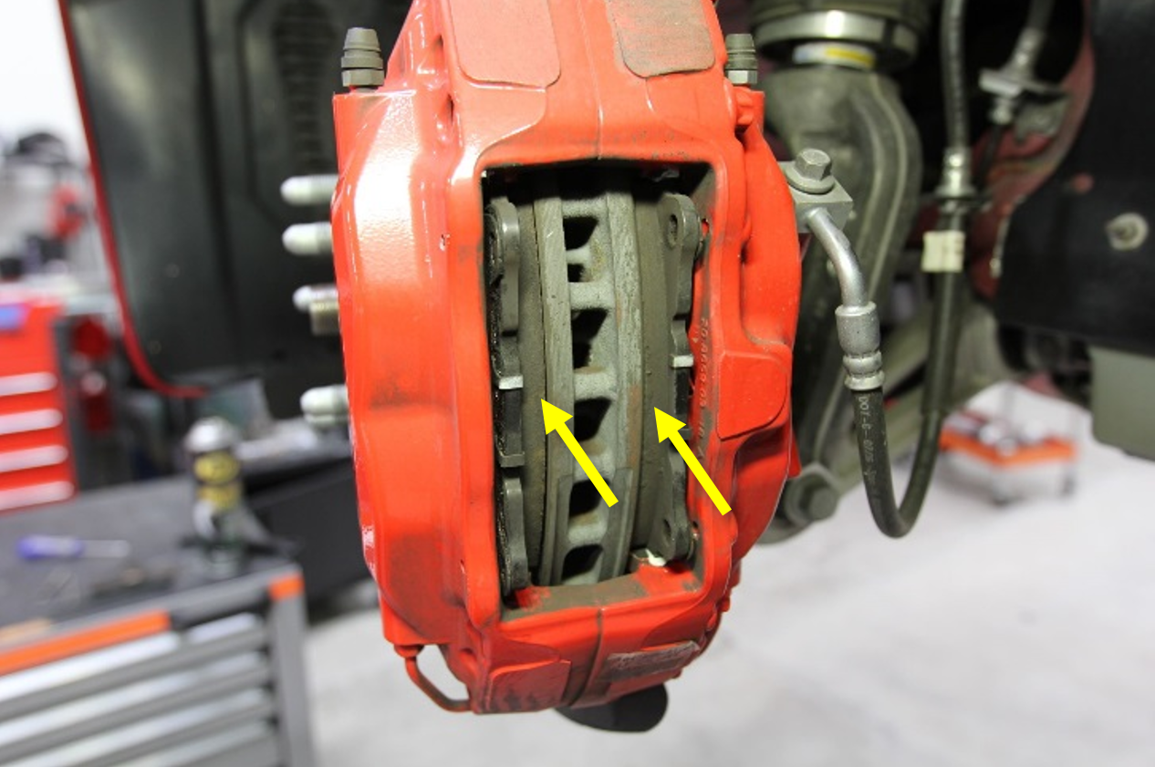 - Use a caliper spreader to expand the brake pads and compress the pistons back into the front LH caliper.