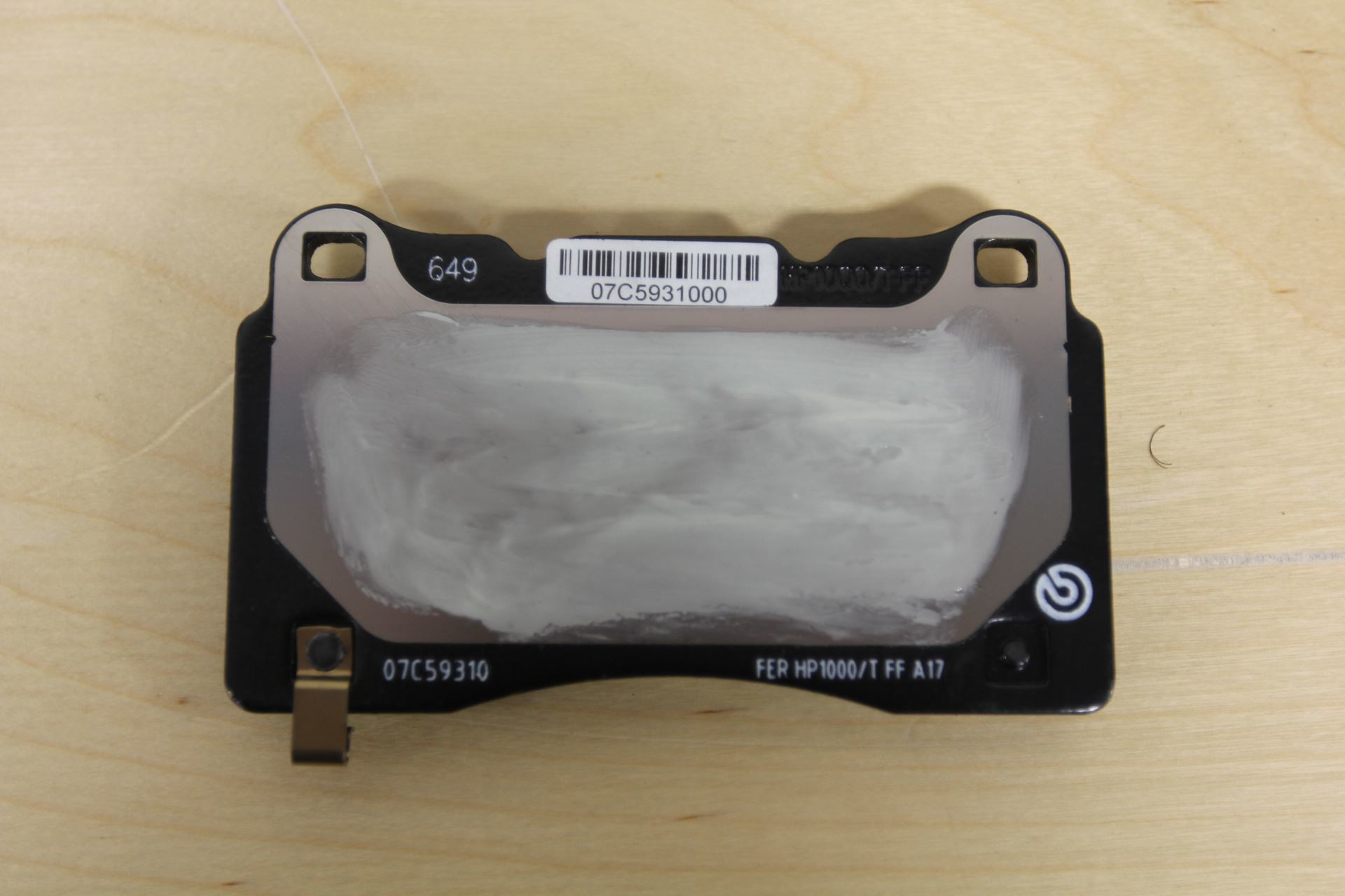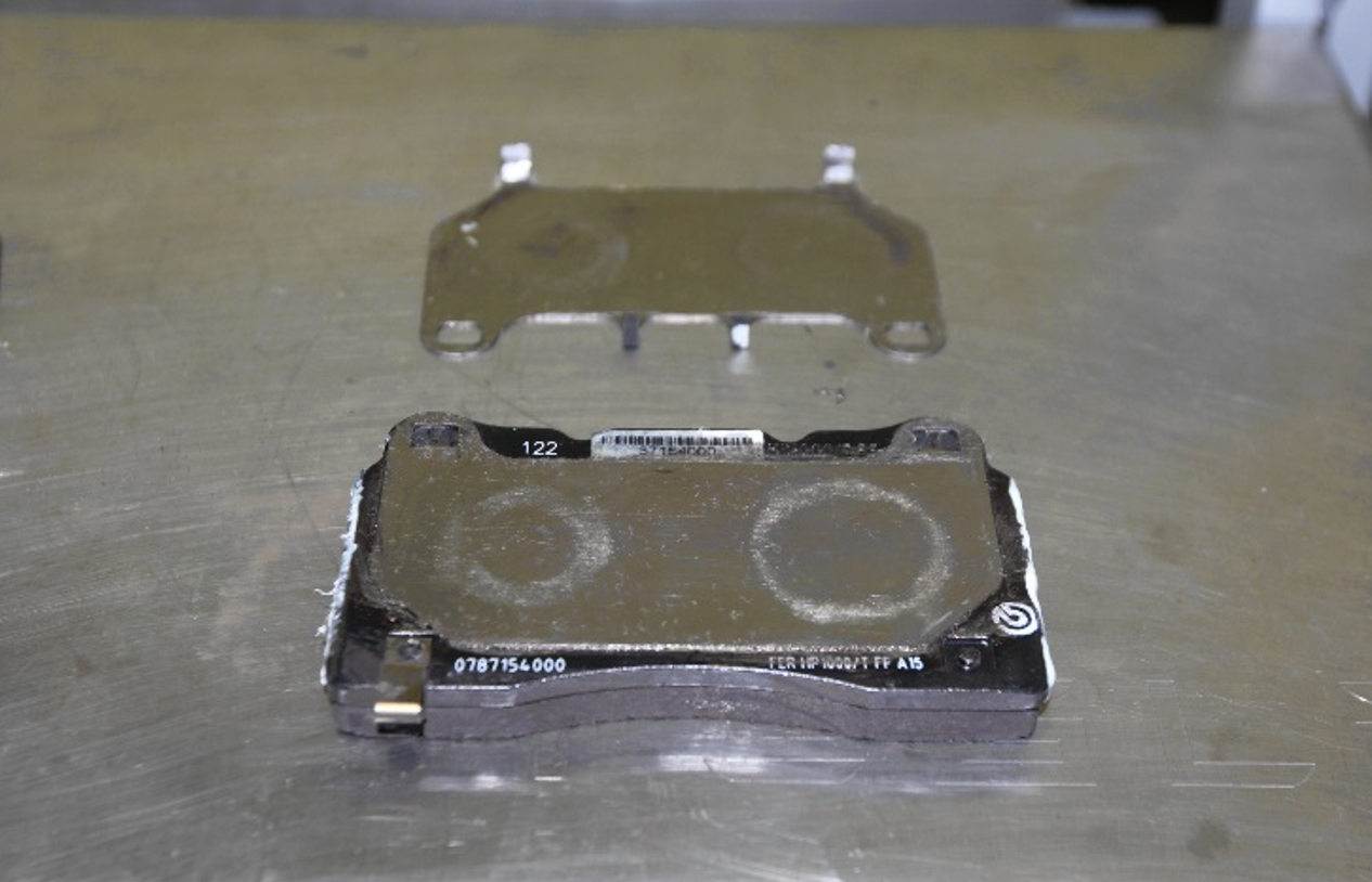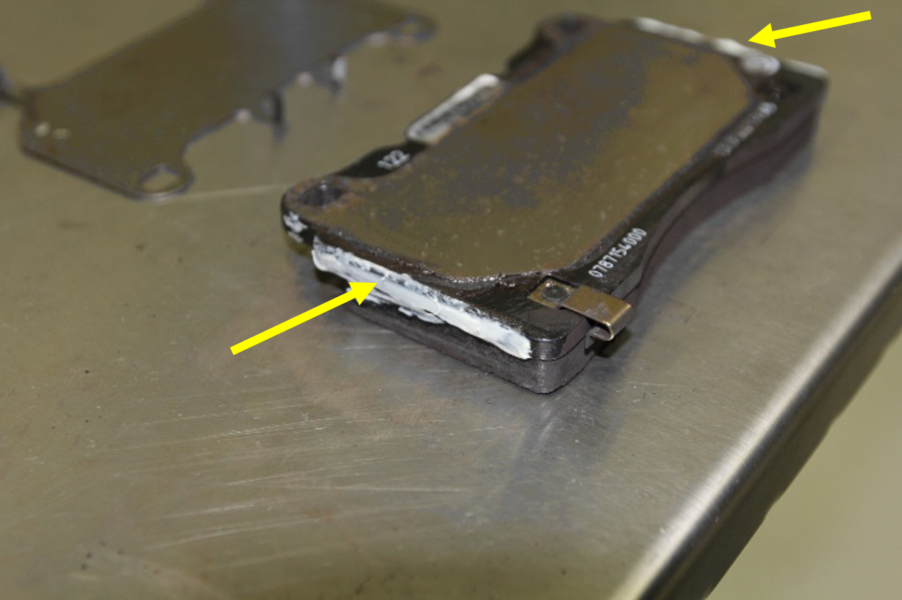 - Apply a thin layer of Tesla-approved brake caliper lubricant between the two shims that attach to the back of each brake pad.