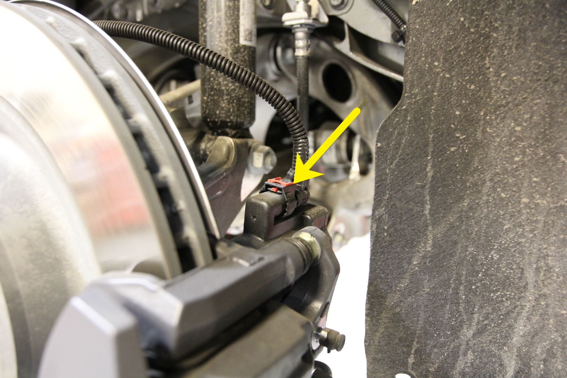 - Release the red retaining tab and disconnect the electrical harness from the rear LH caliper connector.