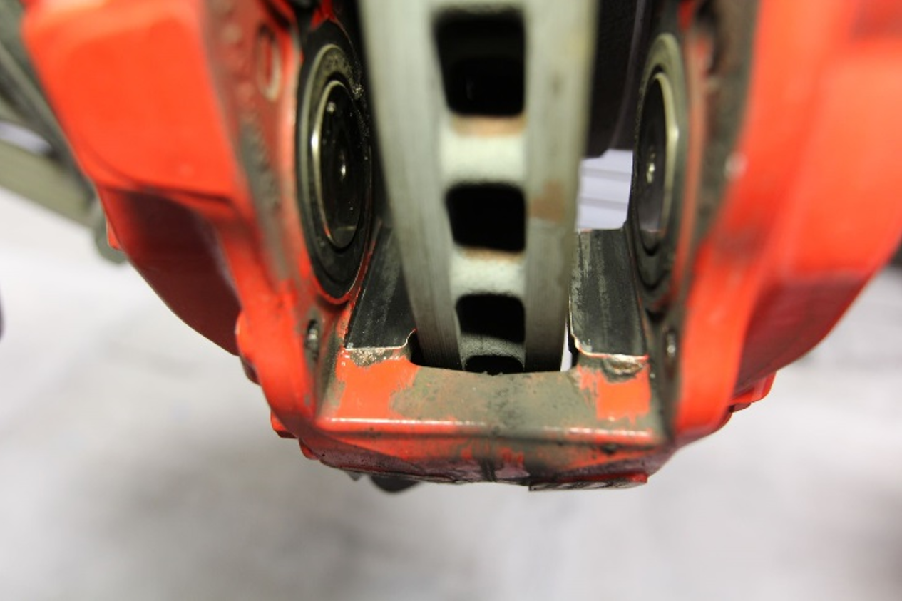 the inner surfaces of the front LH caliper, the retaining pins, the