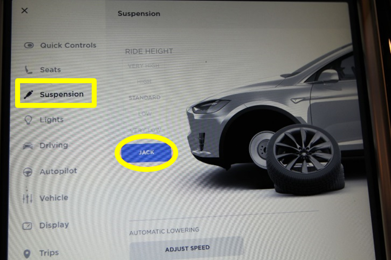 - If the vehicle has an air suspension, on the vehicle touchscreen, touch Controls (vehicle icon), touch Suspension, press and hold the brake pedal and touch Jack to activate Jack Mode.