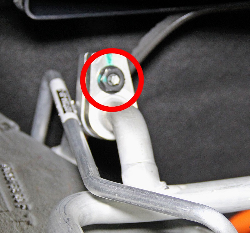- Remove the nut that secures the charge-port-to-rocker high/low pressure pipes bracket to the stud on the body of the vehicle (torque 5.5 Nm).