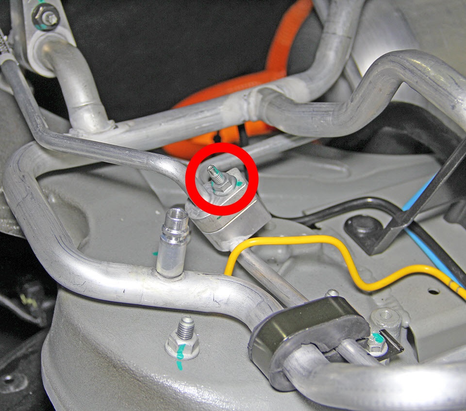 - Use a mirror to inspect the O-rings on the charge port high/low pressure pipes. Replace the O-rings if necessary.