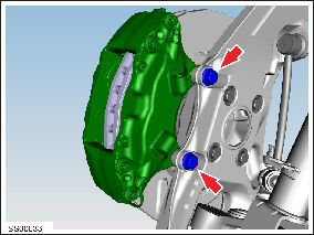 - Remove the bolts (x2) that attach the LH front caliper to the LH front knuckle, remove the caliper from the knuckle, and then use the brake caliper S-hook tool to support the caliper..