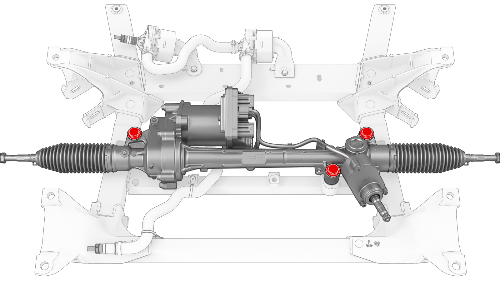 - Remove the bolts (x3) that attach the steering rack to the front subframe assembly, and then remove the steering rack from the subframe.