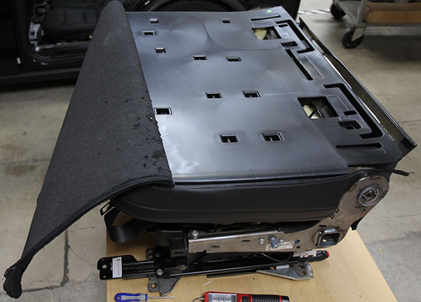 - Use a clip prytool to release the clips (x13) that attach the seat back board, and then remove the back board from the seat.