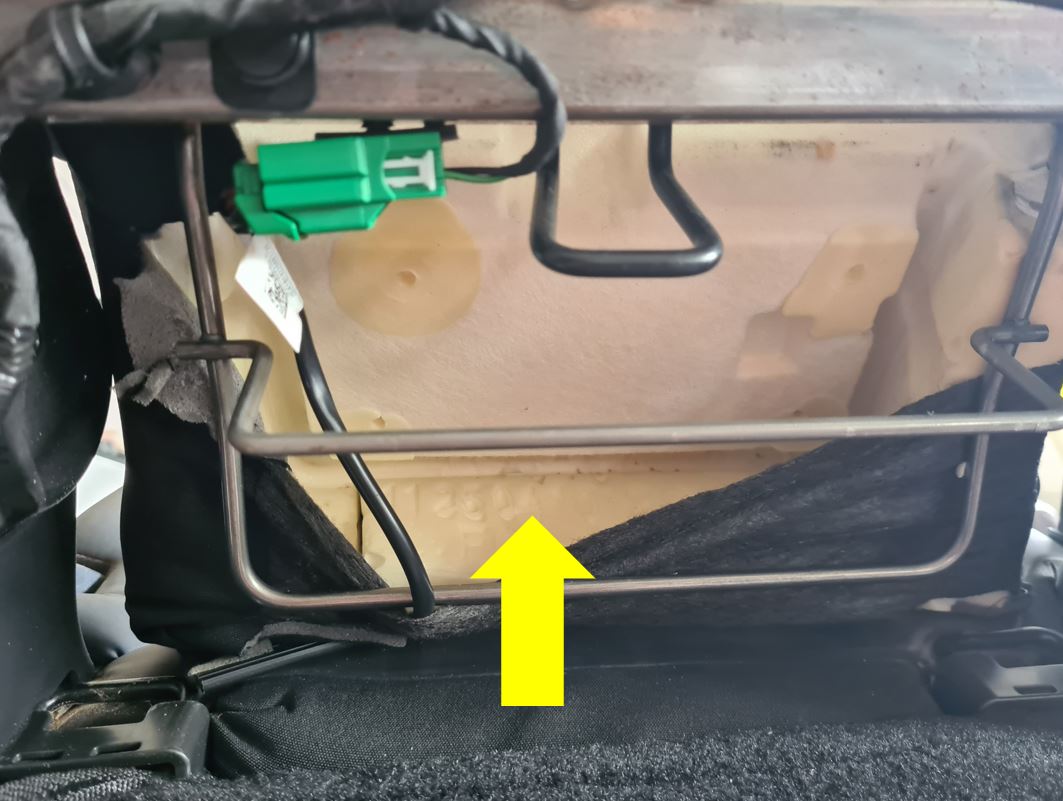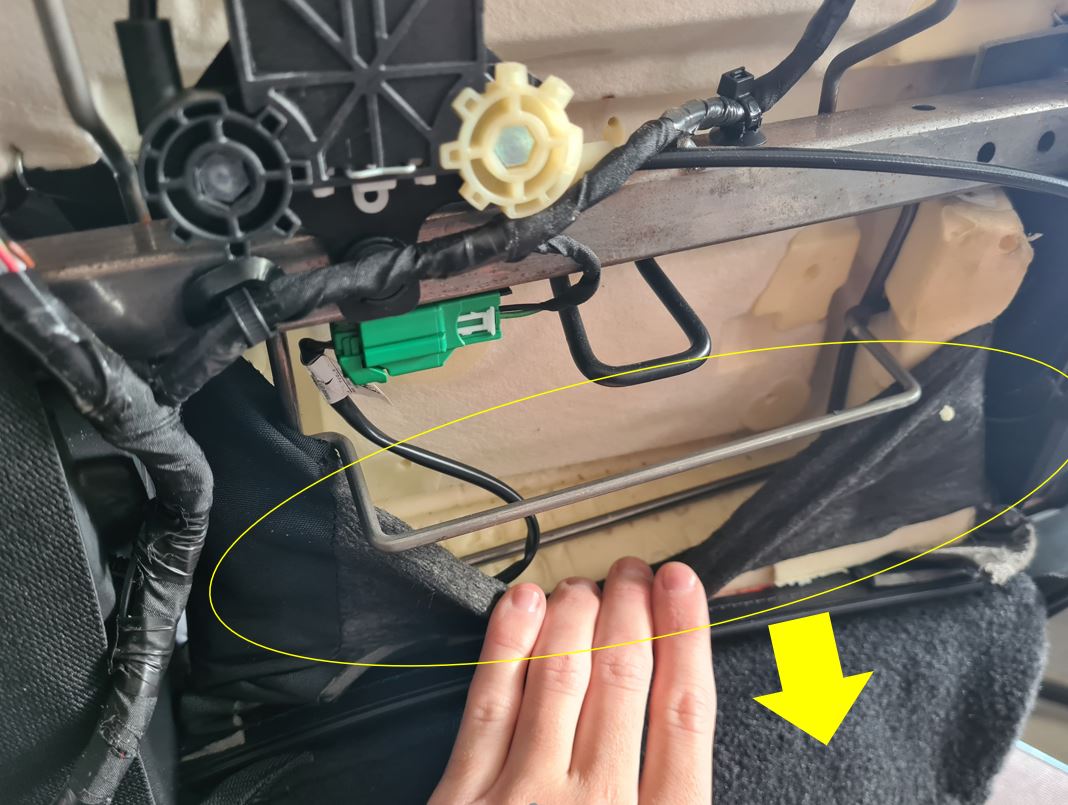 - Unfold the seat, and then move the back trim subassembly retention band under the seat frame.