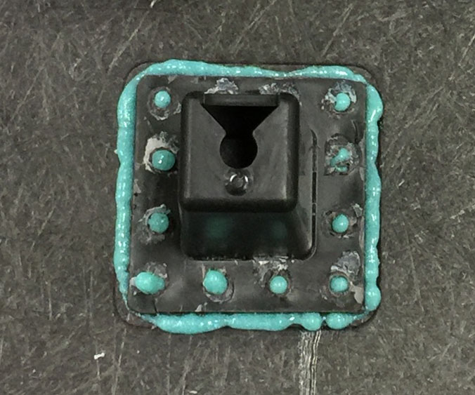 - Install the standoff on the floor panel. Press firmly so that the adhesive flows through the holes on the standoff.