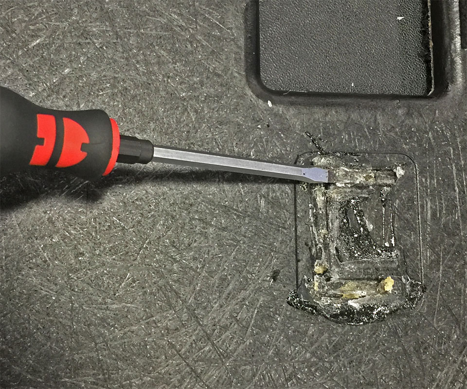 - Use a narrow scraper or flat blade screwdriver to remove old adhesive from the mounting groove on the floor panel.