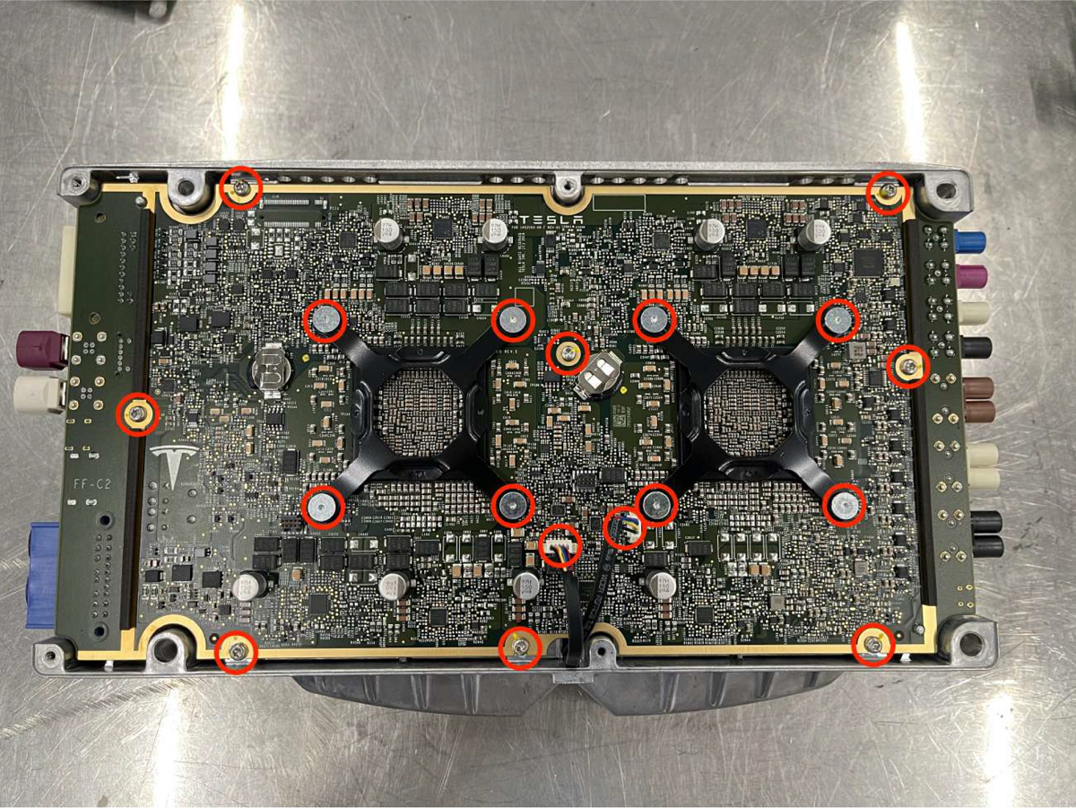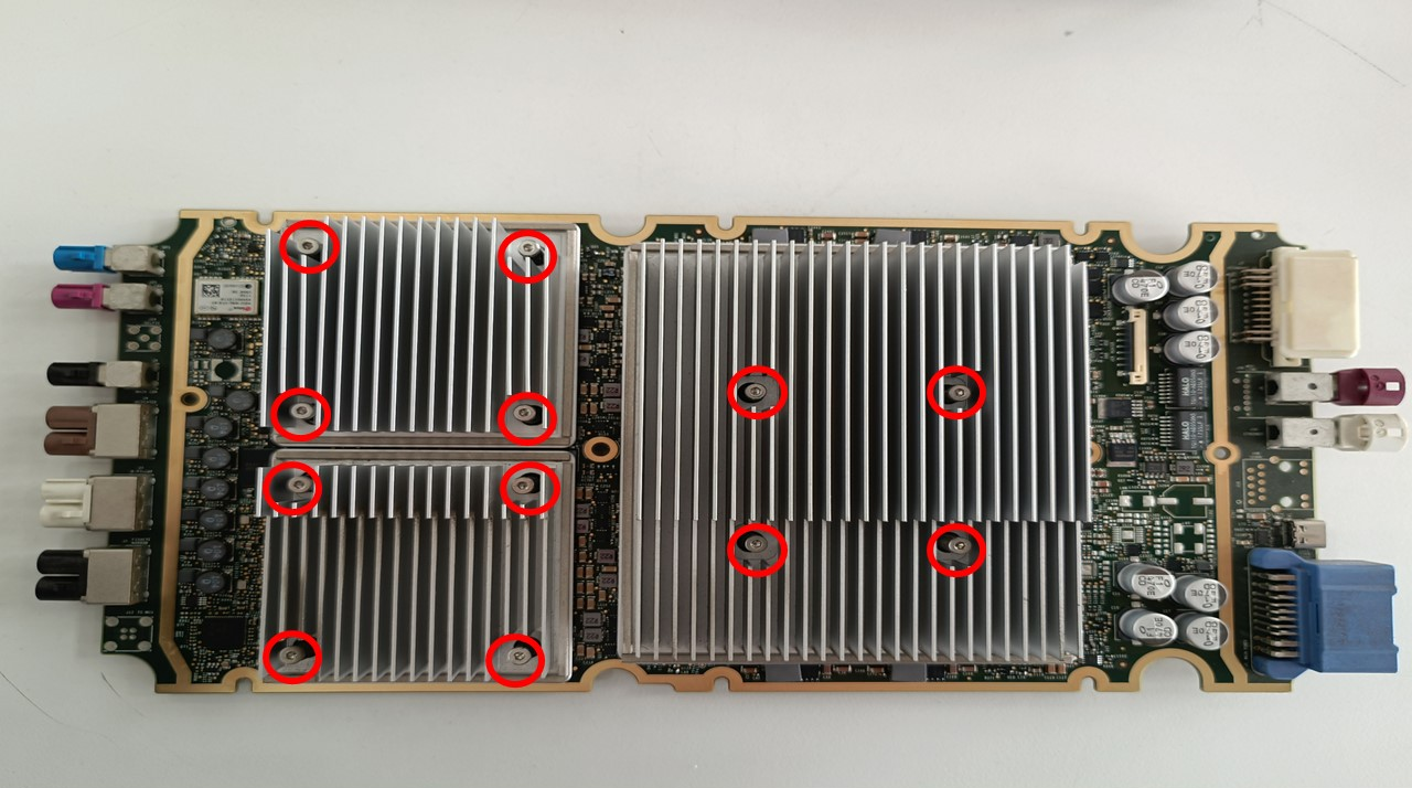 - Flip the PCBA over, and then remove the bolts (x12) that attach the heatsinks to the PCBA.